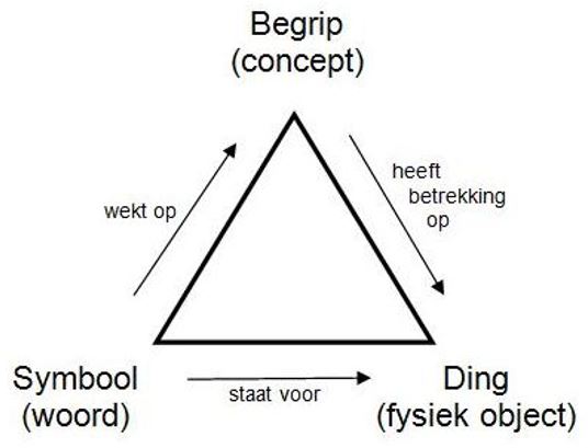 Deze semiotische driehoek is een verdere uitwerking van de visie van de grondlegger van de moderne taalwetenschap, de Zwitser Ferdinand de Saussure. Hij introduceerde de twee termen signifiant ‘betekenaar’ en signifie ‘het betekende’. Deze termen worden hier vanaf het begin als synoniemen van woord(vorm) en betekenis gebruikt. (….)